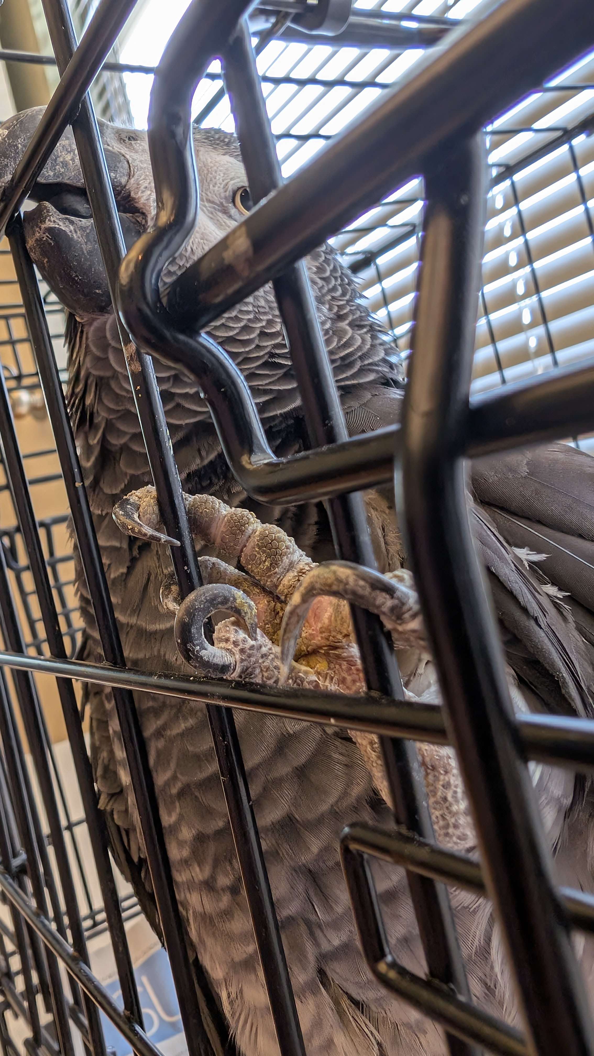 Old and arthritic, Caesar is unable to properly groom himself, so he had poor feather condition and a buildup of keratin. He has since had a full bath and looks lean, dark, and hansome!